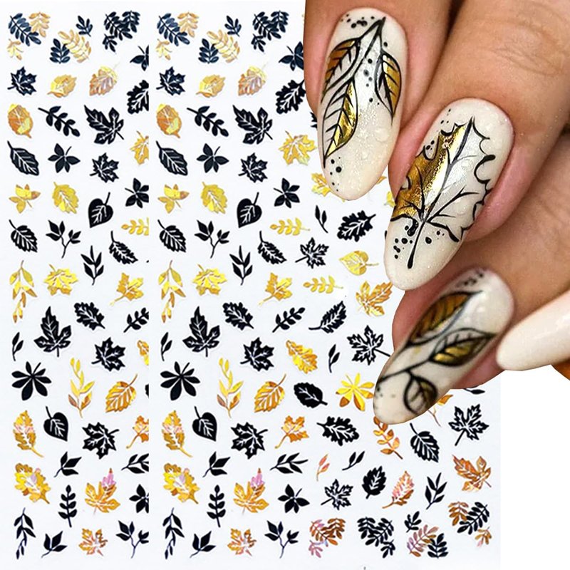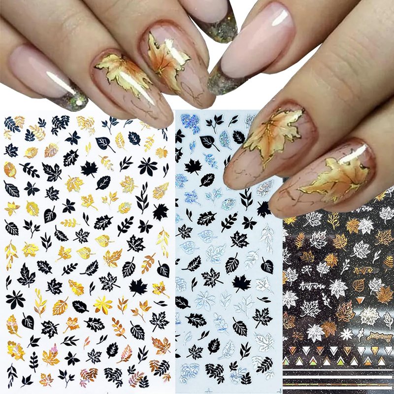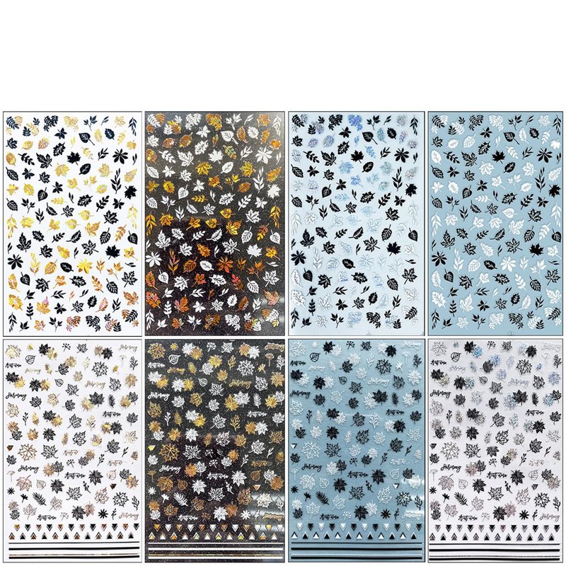 - Package: 8 sheets Autumn maple leaves nail stickers,gold black/gold white/black silver/black white holographic laser fall nail art decorations set for Thanksgiving DIY their own nail styles as they like.