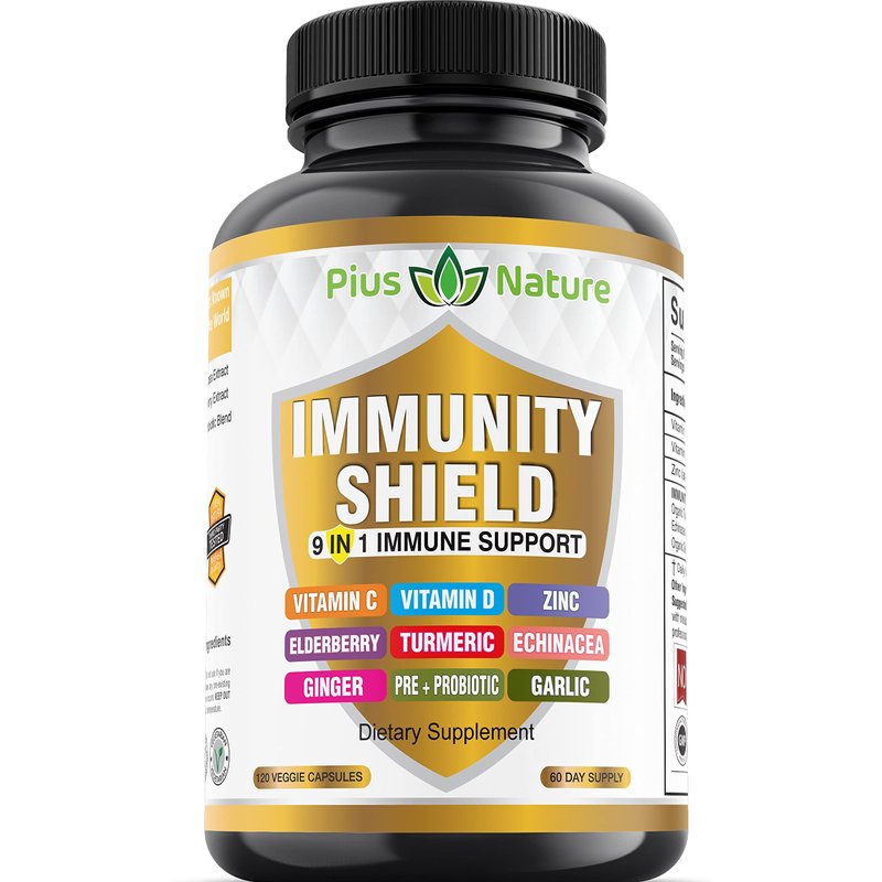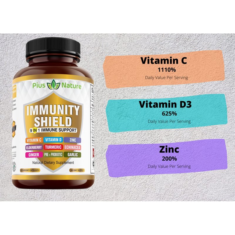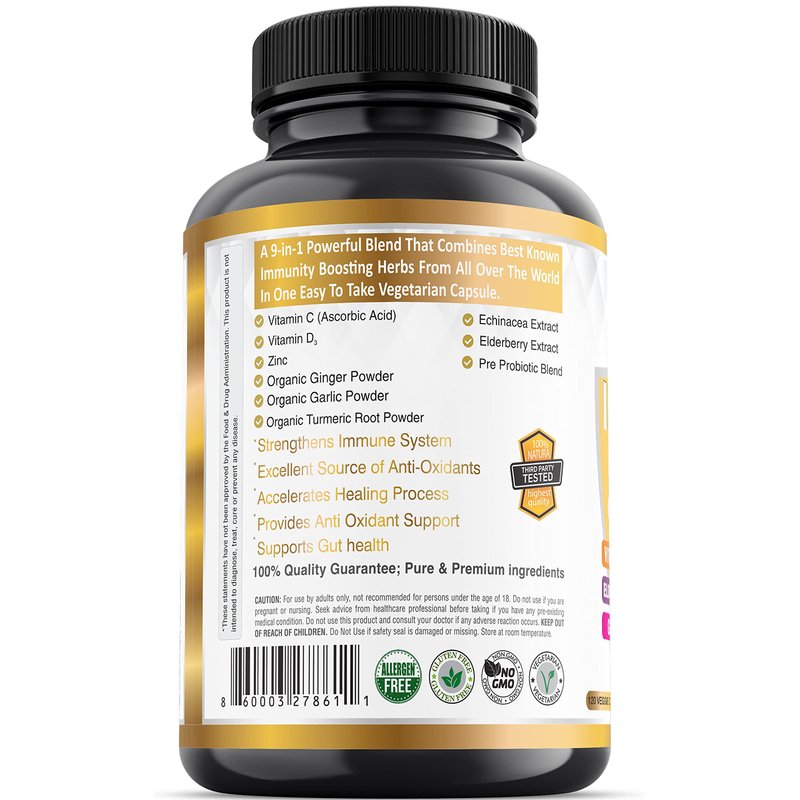 9-in-1 Immune Support : Vitamin C, Vitamin D3, Zinc, Echinacea, Elderberry, Pre + Pro Biotics, Turmeric, Ginger and Garlic in 120 veggie capsules per bottle and 1527 mg per serving for a full 2 month supply