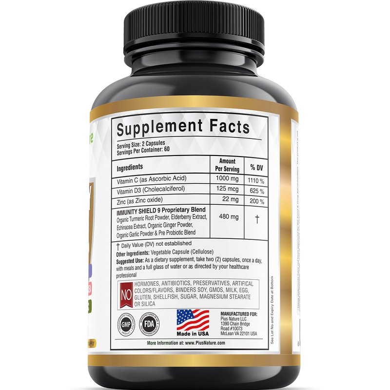 9-in-1 Immune Support Vitamin C (1000mg), Vitamin D3 (5000 IU), Zinc(22mg) with Elderberry, Turmeric, Echinacea, Ginger, Garlic and Pre+Pro-Biotic per serving (120 caps per bottle - 2 month supply)