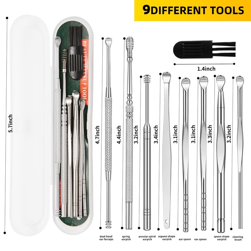 - 👂EAR CLEANSING TOOL:9 differently sized curette cleaners to clean both soft and hard ear wax efficiently to give your ear canals a relaxing massage and proper cleaning.These are professional tools for caring for your ears.