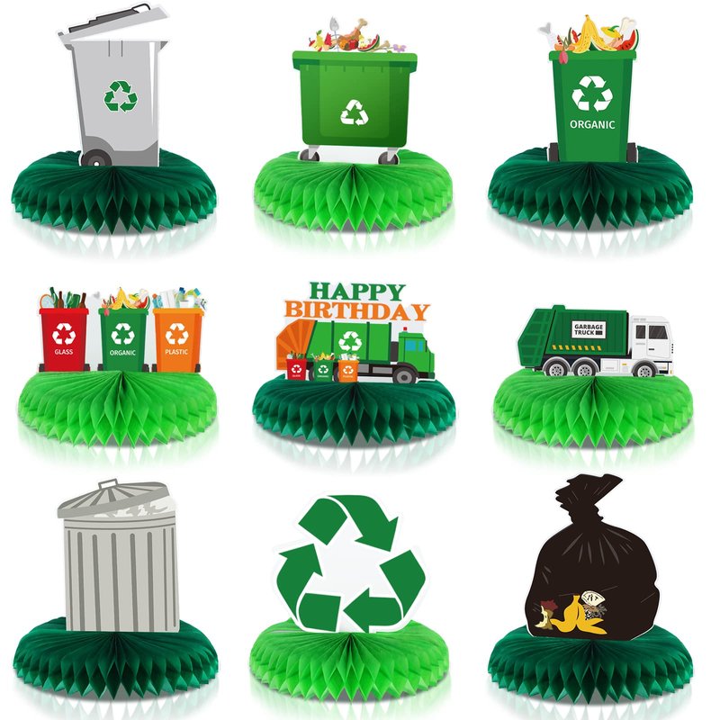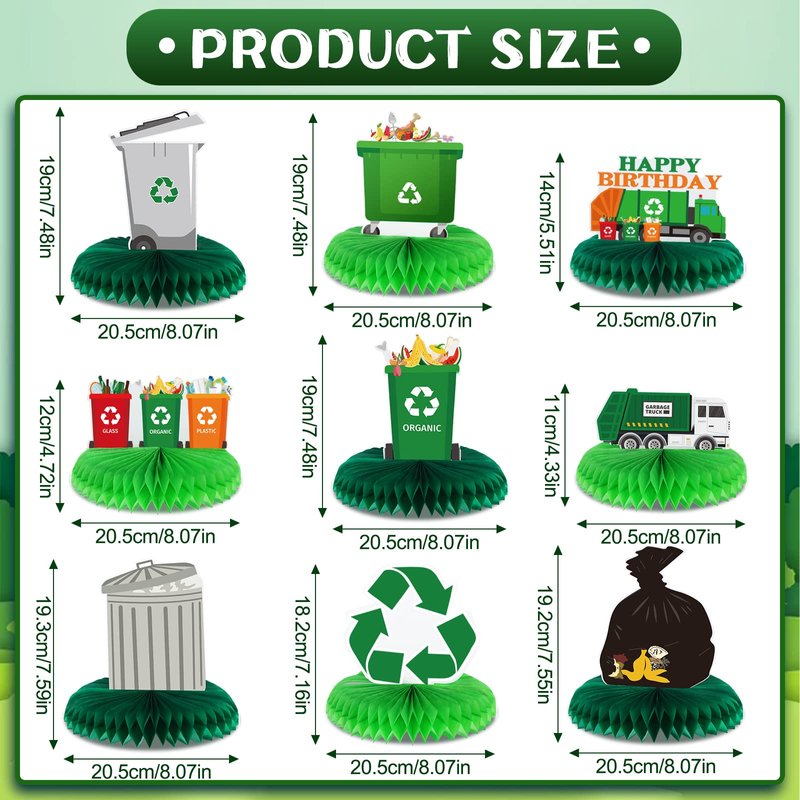 - Distinctive Designs: the garbage truck birthday centerpieces for tables have 9 funny appearances, such as garage truck, trash can, and more, most importantly, they are mainly paired with green colors, they are vivid overall, which will add fun and humorous to your party