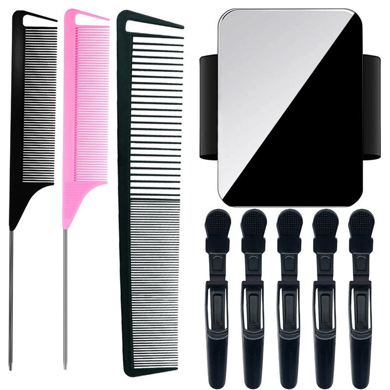 9 Pcs Hair Parting Comb Rat Tail Comb Set- 2 Pieces Braiding Comb Styling Comb 1 Fine and Wide Tooth Comb and Magnetic Wrist Sewing Pincushion Pin Cushion Holder with 5 Alligator Hair Clip (Black)