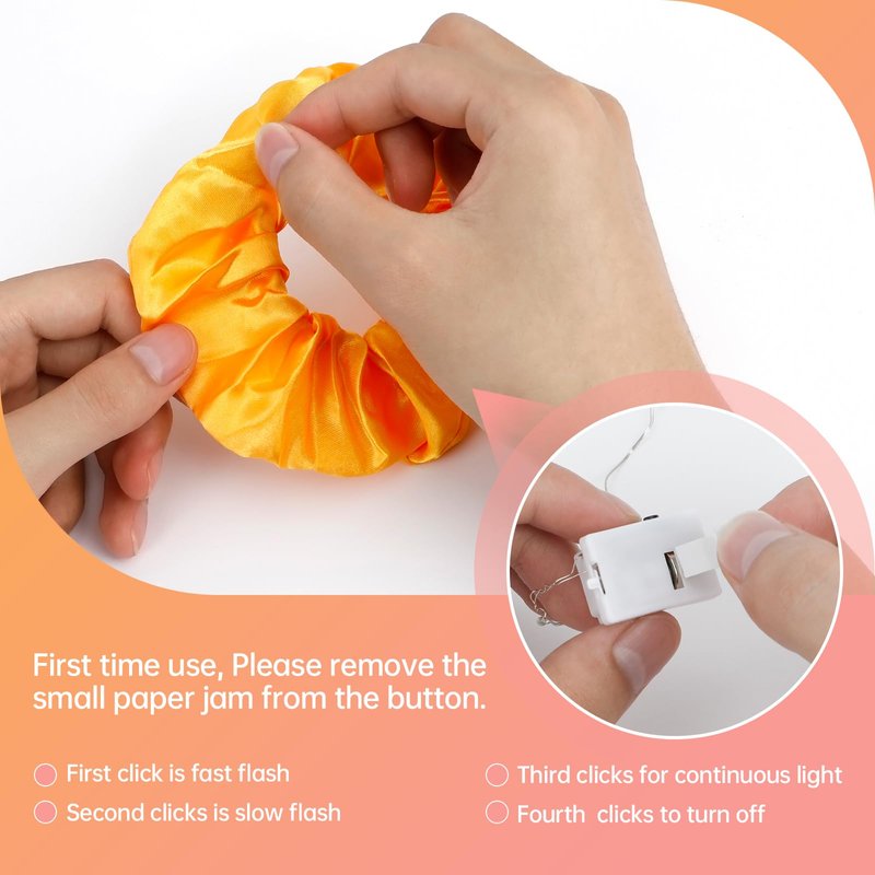 - 3 Light Modes: Fast flash, slow flash, and constant light. Easily remove the plastic sheet inside the hair scrunchies from the outside of the satin hair scrunchies, then find the button and press it.