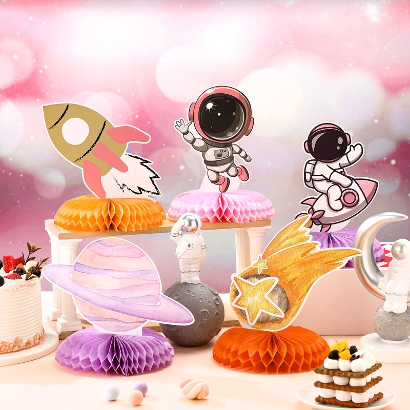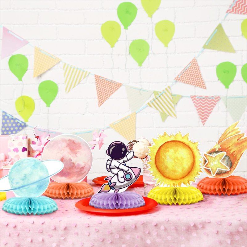 - Outer Space Table Toppers Kit: you will receive 9 pieces of outer space honeycombs in one package, and they come in 9 different designs, including astronaut, rocket, meteorite, sun and some planets; Diverse designs can bring a strong space themed atmosphere to your party, and make your party a big hit