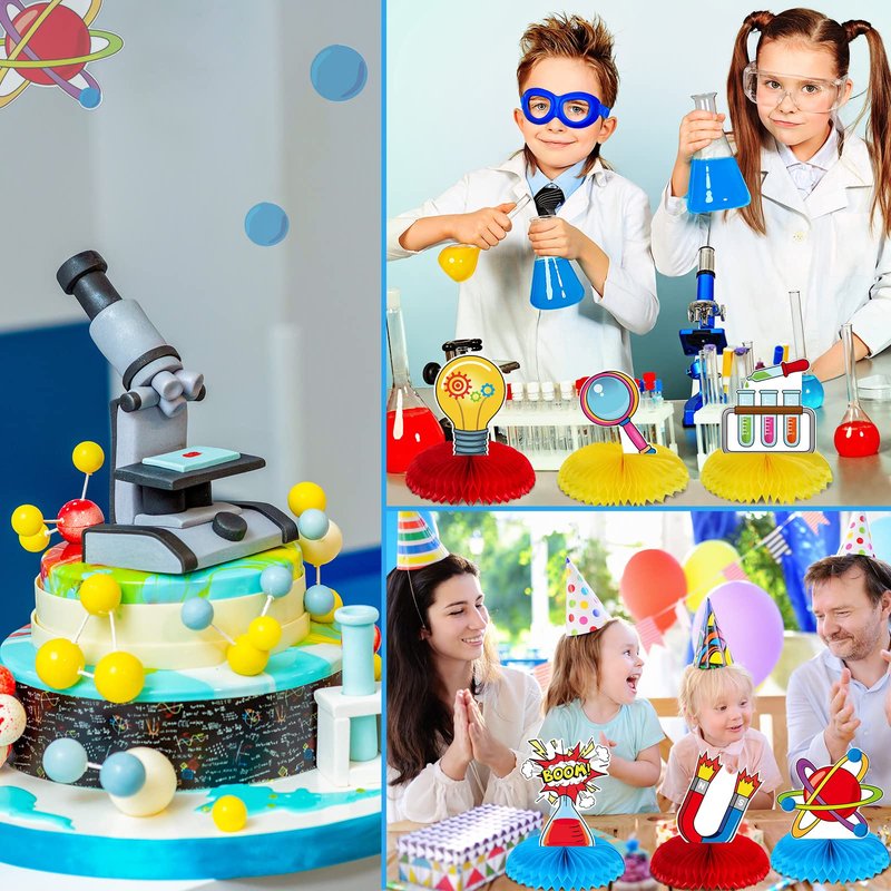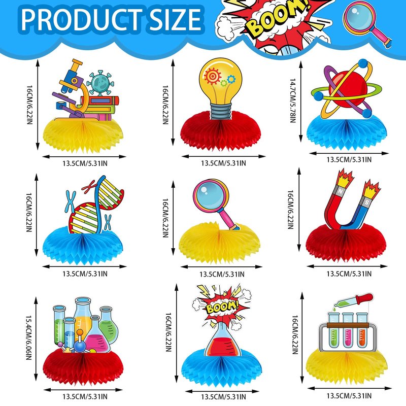 - Science Party Decor Kit: there are 9 pieces of science party favors honeycomb centerpieces in different styles, including light bulb, magnet, magnifying glasses, lab bottles, etc.; That is a fun way to decorate your party with the colorful and interesting science party decoration set