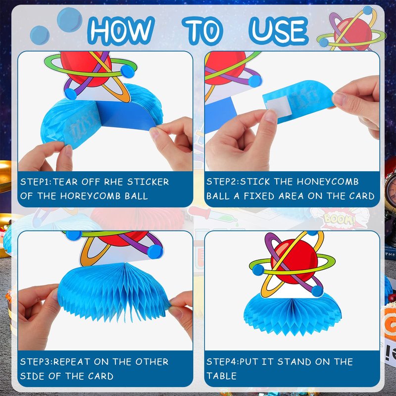 - Simple to Use: it is easy to use these science party supplies; You just tear off the glued sticker on the back of the honeycomb, and then unfold the honeycomb, finally paste the card pattern and you will get a lovely honeycomb decoration