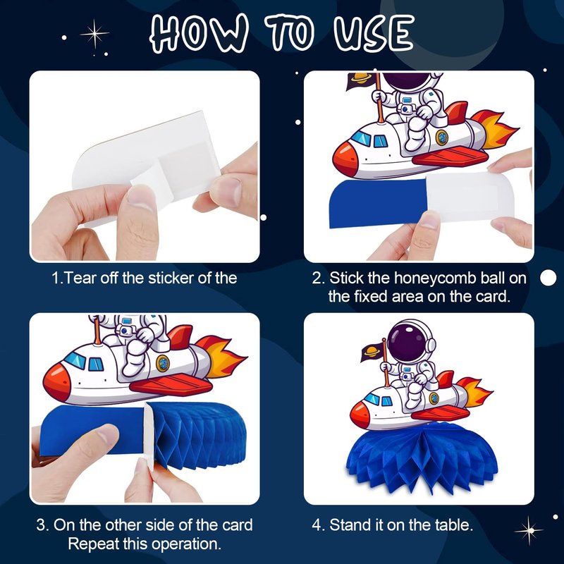 - Easy to Assemble: The outer space birthday decorations are simple to assemble. Peel off the double-sided tape, unfold the honeycomb base, and paste them together. Then you get a beautiful space table decor. These space themed decorations make your party cheerful and fun.