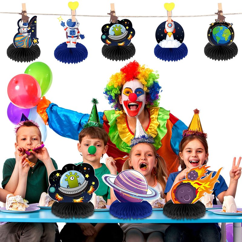 • Package content: you will get 9 pieces outer space theme honeycomb centerpieces in different styles, inluding astronaut, spaceship, rocket, planet, UFO, and so on, save your and family boring time and add a colorful display for your party table decorations