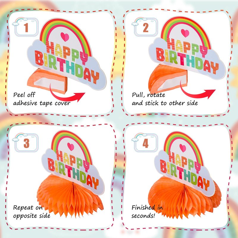 - Easy Assembly: the rainbow party centerpieces come in a flat pack for better protection and is easy to assemble; Just connect the 2 sides together; Unfold the honeycomb for baby shower birthday party table decorations and pull the edges of the sides, then peel off the tape above and glue or staple the sides together, and you can reuse it, no assembly required