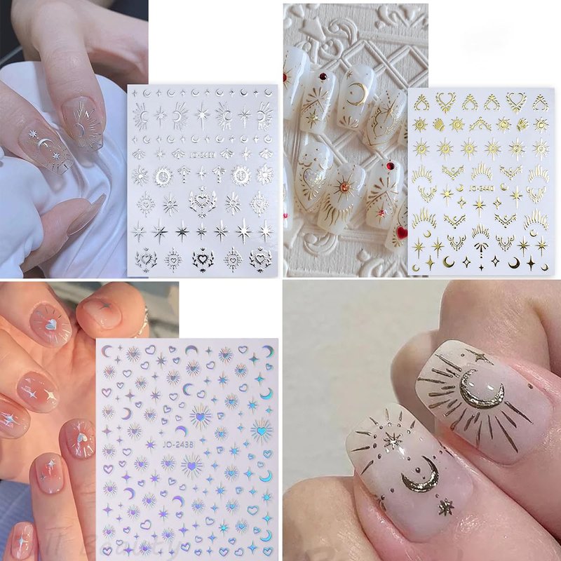 - Gold Silver Nail Stickers Set: You will get 9 sheets special design moon star nail art stickers, geometry stars moon sun nail designs decoration. It provides you with a variety of options to give, bringing you more inspiration for nail DIY design creation. Make you have a special nail art on a date!
