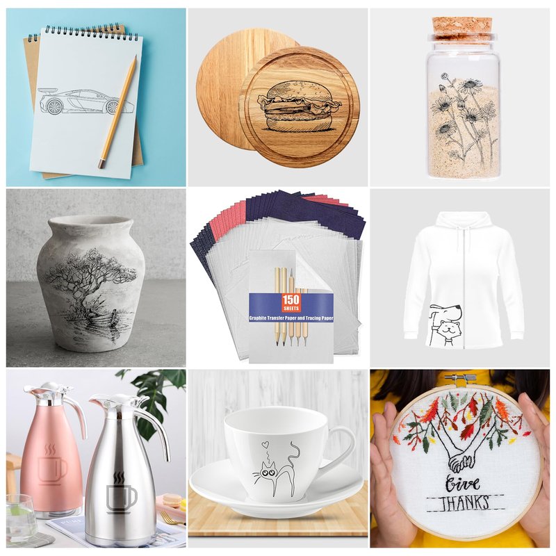 Carbon paper sheets ideal for home or office, carbon transfer paper can be used to tracing & transferring design, pattern or images onto canvas, cardboard, paper, wood, glass, metal, ceramic, clay, light fabric and so on.