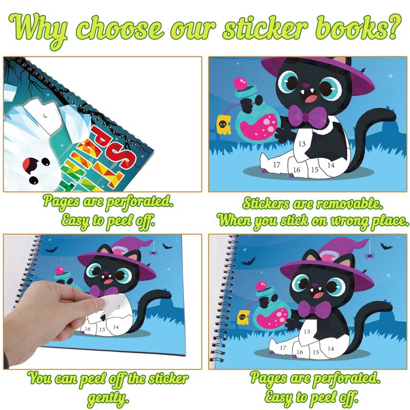 • Books are perforated page designs - Package includes 2 Halloween themed sticker books and 22 sheets of stickers.Each book has 11 different Halloween element picture pages,can be finished 22 pictures in total.All the pages are perforated.It’s easy to tear off your finished work to share with your friends or frame it up.