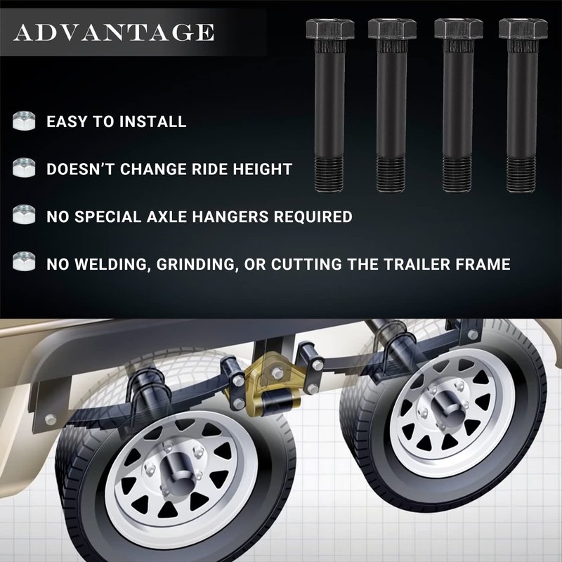 - Package Include – 4 bolts and 4 nuts. Easy to install; No welding, grinding, or cutting the trailer frame; No special axle hangers required;Doesn’t change ride height.