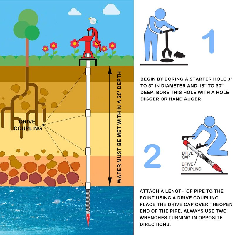 When the well point is driven into the ground, through the coupling connection, additional sections of pipe are connected to the well point and driven into the ground to increase the depth of the well,and allow water to flow throughout the well water system.