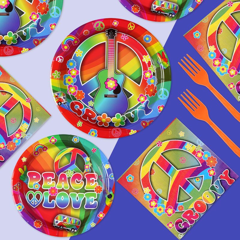 - No Fuss, All funny: The disposable hippie party decoration tableware can be packed up and thrown away directly after use, eliminating the hassle of dishwashing and allowing you to have more time and energy to relive the nostalgia of the 60's with your family and friends