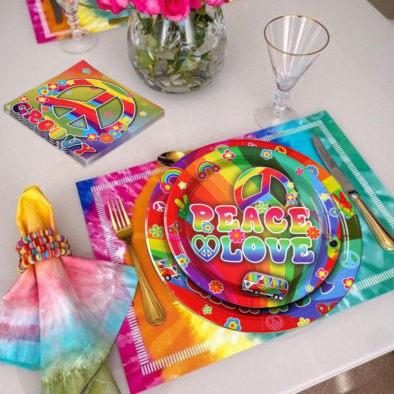 - What You Get: You'll get a 96 pcs hippie tableware set that includes 24 9" hippie themed plate, 24 7" hippie themed plates, 24 napkins and 24 forks for up to 24 guests per set, transform your hippie party into an unforgettable 60's psychedelic adventure