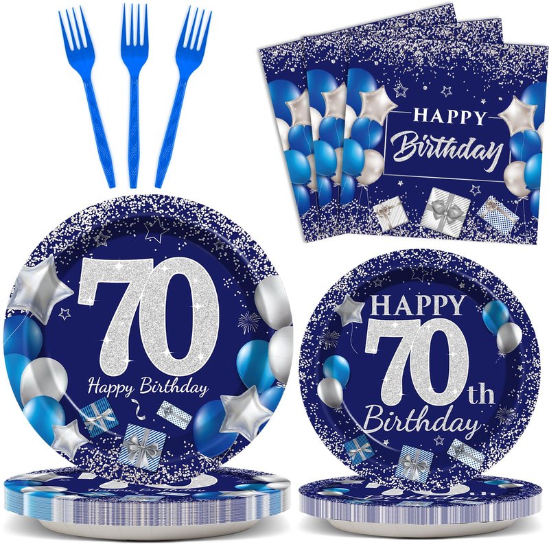 24 pieces 70th birthday plates of 9inch, 24 pieces plates of 7inch, 24 pieces navy blue and silver birthday party napkins of 6.5inch and 24 plastic blue forks for each set that can serve 24 guests.