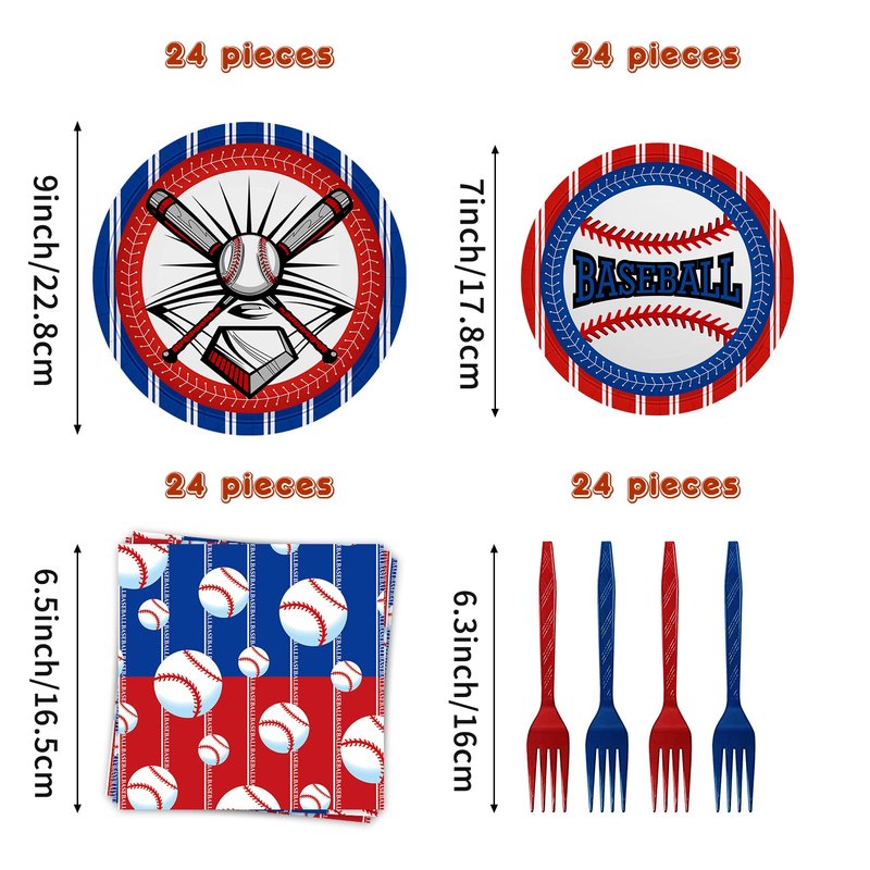 - Package Includes: You will receive 24 pieces of 9-inch baseball party plates, 24 pieces of 7-inch baseball desert plates, 24 pieces of baseball forks, and 24 pieces of baseball napkins, 96 pieces in total; these baseball party supplies will be sufficient to meet your needs for serving 24 guests.