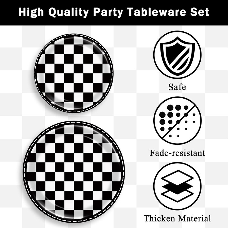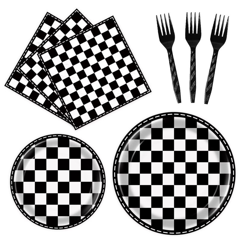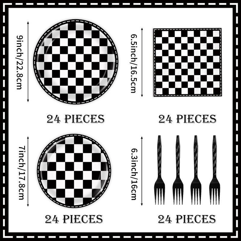- Package Includes: You will receive 24 pieces of 9-inch checkered paper plates, 24 pieces of 7-inch race car plates, 24 pieces of forks, and 24 pieces of checked plates napkins, 96 pieces in total. These racing birthday party supplies will be sufficient to meet your needs for serving 24 guests.