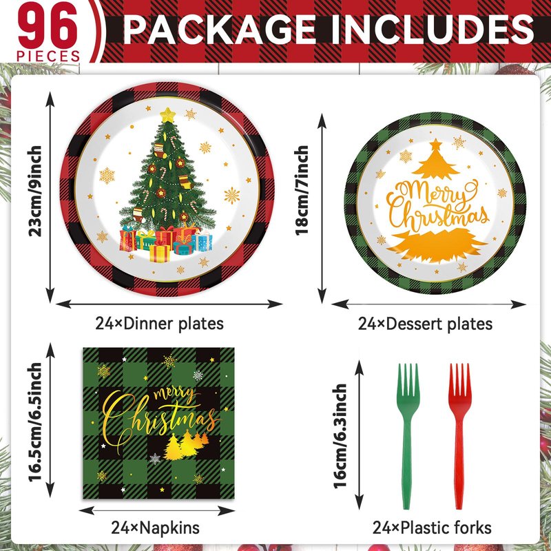 - Christmas party supplies: This package includes 24pcs 9inch Christmas paper plates, 24pcs 7inch Christmas dessert plates, 24pcs 6.5inch plaid Christmas party napkins and 24pcs forks colored in red and green, enough quantity to serve 24 guests.