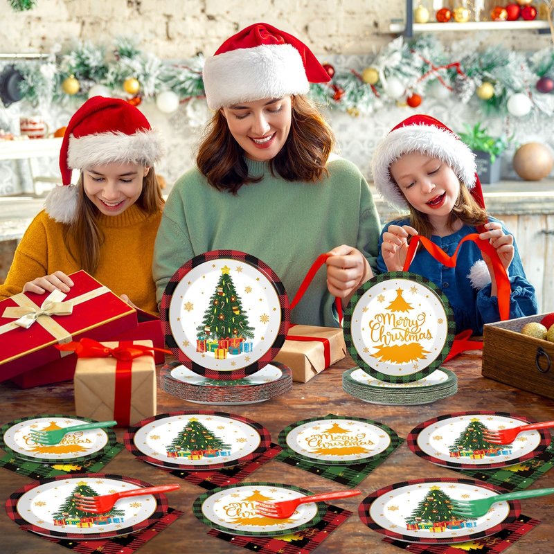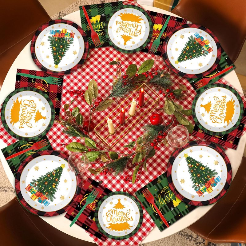 - Convenient: This Merry Christmas tableware kit is completely disposable, plaid Christmas dinnerware plates, Xmas party napkins and plastic forks just throw away after use, reducing your clean-up time that you can have more time with your family.