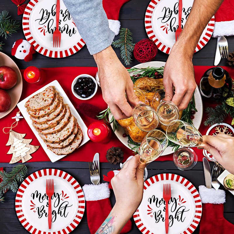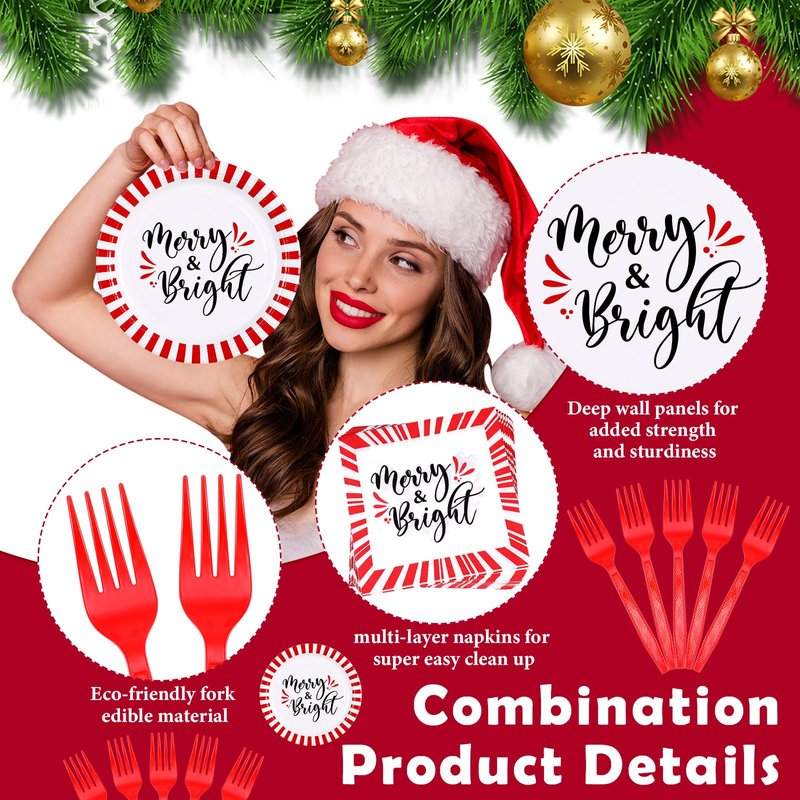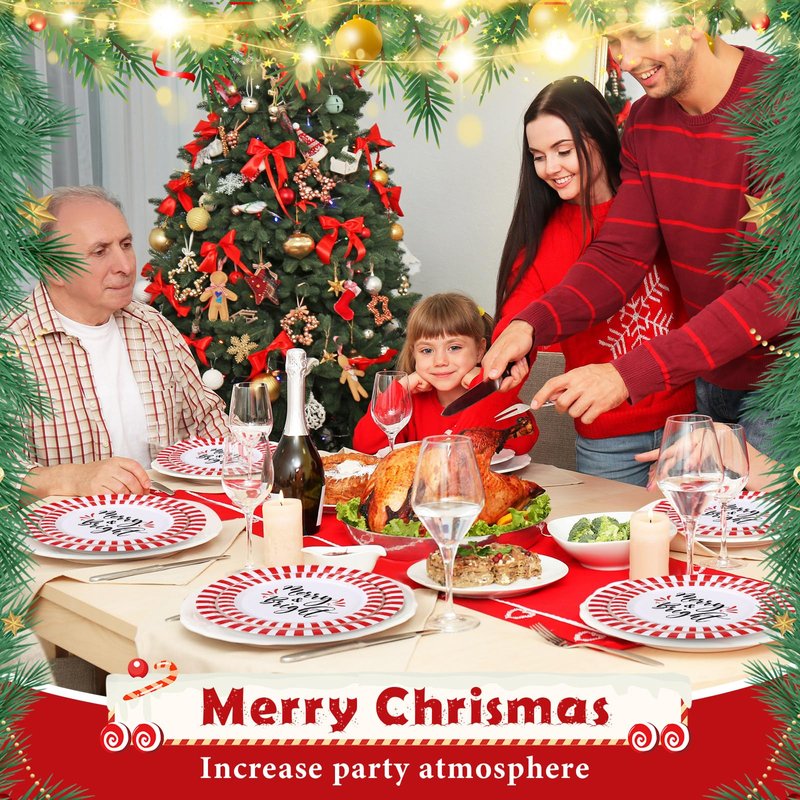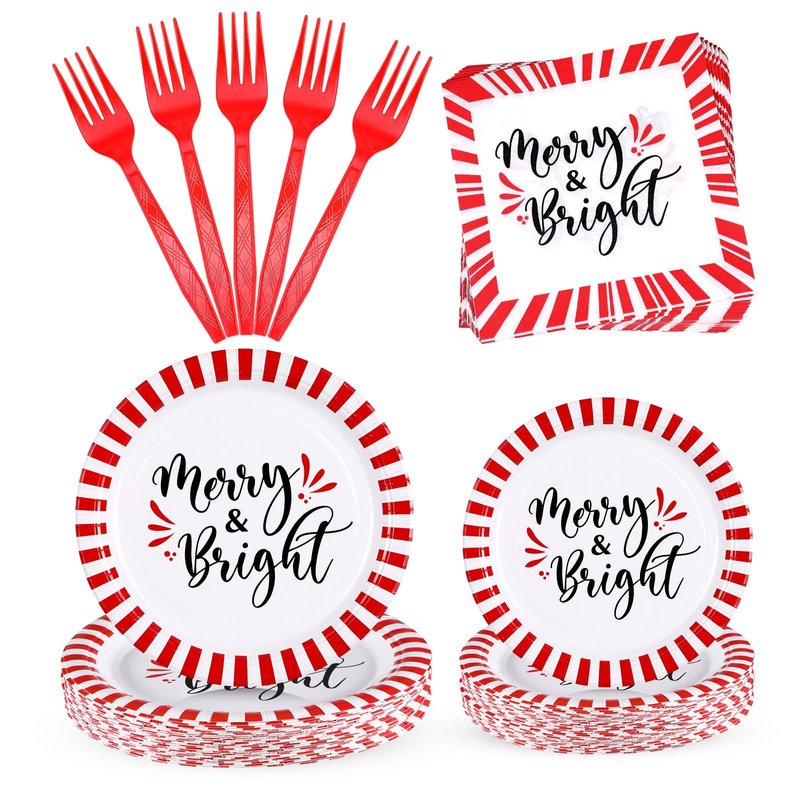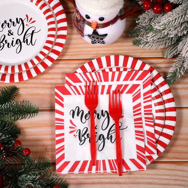 - Christmas Dinnerware Set: the package includes 48 pcs Christmas paper plates (7 inch and 9 inch), 24 pcs red and white stripe napkins, and 24 pcs forks, a nice combination to serve 24 guests