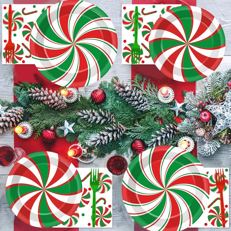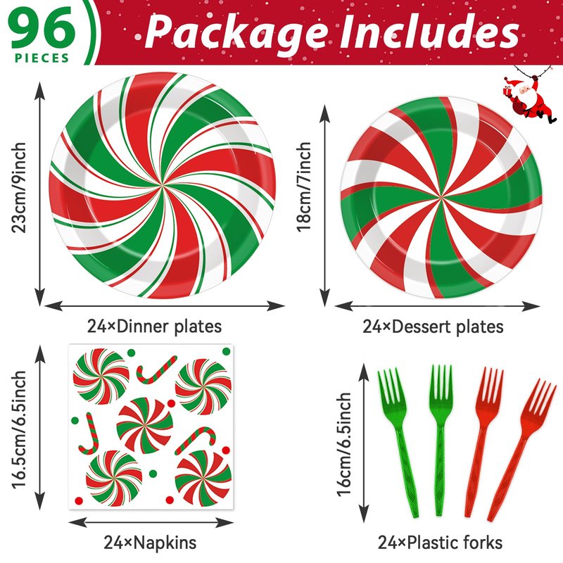 - Christmas peppermint party supplies: Includes 24 * 9inch Christmas paper dinner plates, 24 * 7inch plates, 24 * 6.5inch Christmas napkins, 12 red plastic forks and 12 green plastic forks, which will add fun to Christmas theme party. Can be applied for Christmas dessert plates or Christmas peppermint decorations, all in quantities perfect for serving 24 guests. The peppermint-themed design adds a special touch to your party and makes for a great Christmas party favor.