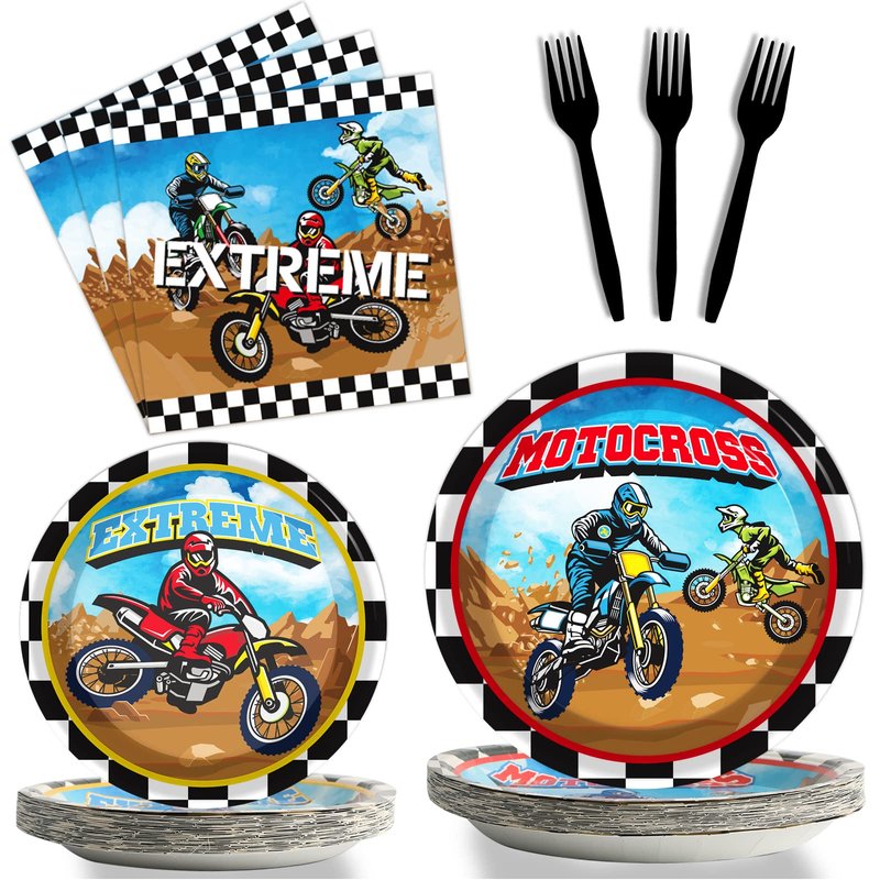 - 【Dirt bike Party Supplies Serves 24】 This dirt bike birthday party supplies set includes: 24 plates (9inch) + 24 plates (7inch) + 24 napkins (13inch) + 24 forks, There are a total of 96 pieces in this set, which will add fun to any dirt bike theme birthday party.