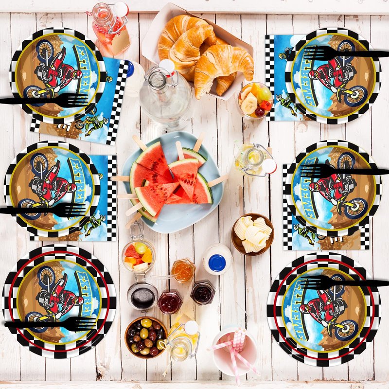 - 【Enjoy Party And Save Time】You will be able to throw a dirt bike birthday party that impresses your guests the entire night. When the party is over, you can spend more time with family or friends and less time cleaning up. That's why we designed this motocross theme birthday party tableware set.