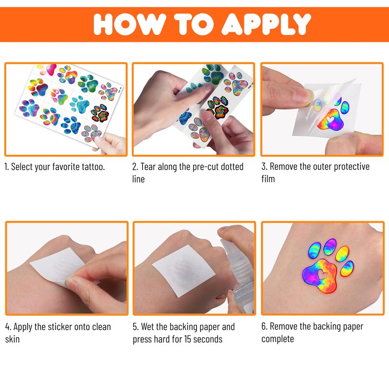 - How to Use: Cut out tattoo of choice and remove clear sheet. Place tattoo face down on skin. Wet the tattoo thoroughly with a sponge. After 20-30 seconds, gently remove the backing paper. Allow the tattoos to dry. Very easy to use.