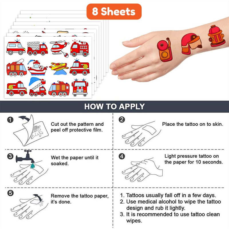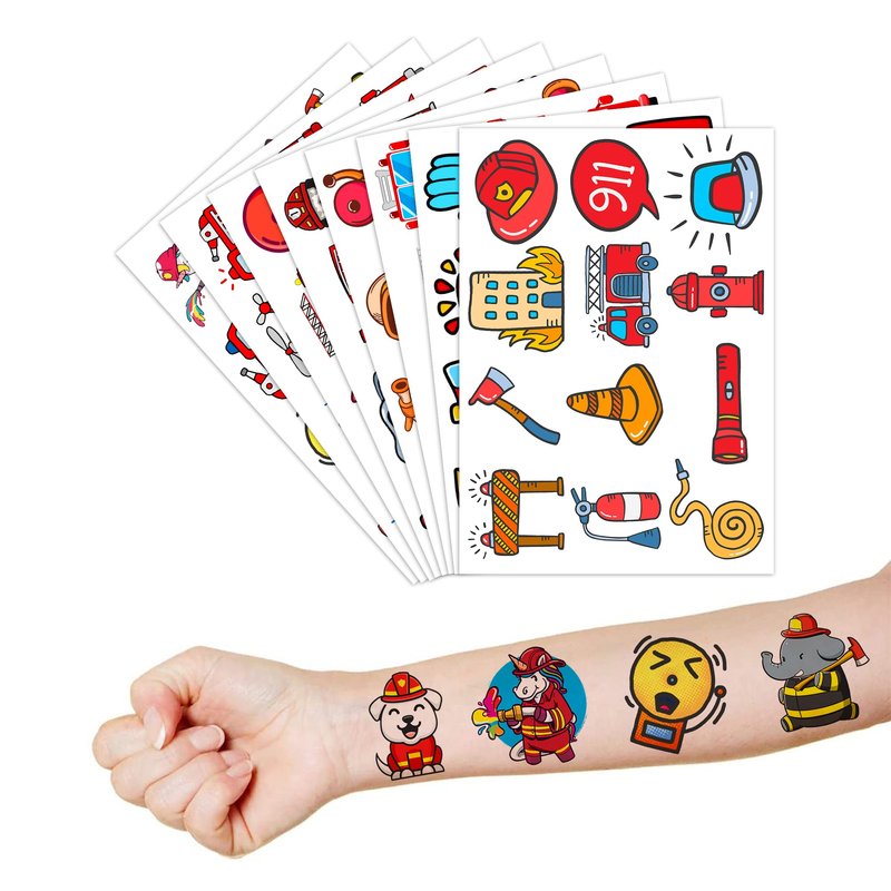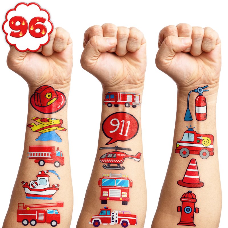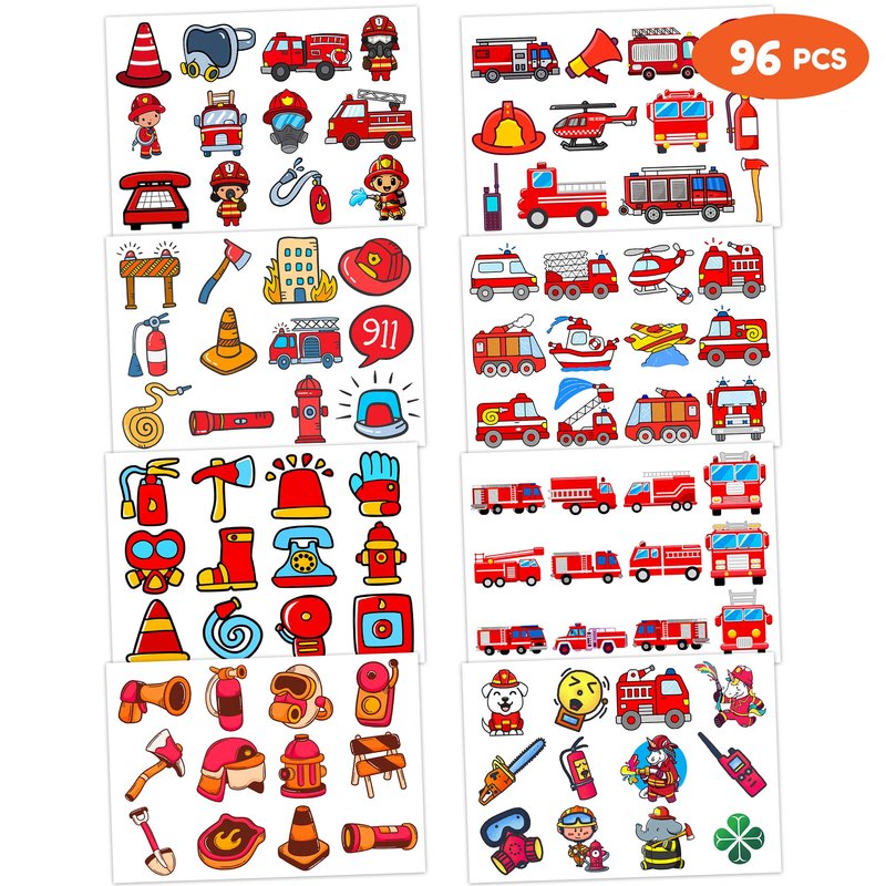 - 🔥 Cute Firefighter Fire Truck Fireman Party Supplies: 8 sheets Firefighter Fire Truck Fireman themed temporary tattoos stickers, features an assortment of cute themed characters, each pattern measures 6.1 x 3.1 inch , all kinds of designs and colors will bring more fun to your party, one size fit all adult and kids.
