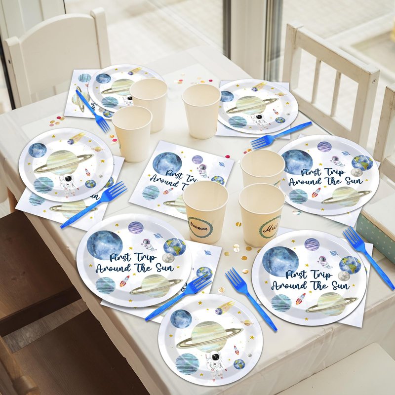 - Unique Design:The design of our 1st trip around the sun tableware set is based on the theme of outer space. The unique retro color system is combined with the outer space element pattern printing, which will bring you a unique artistic conception and beautiful vision.