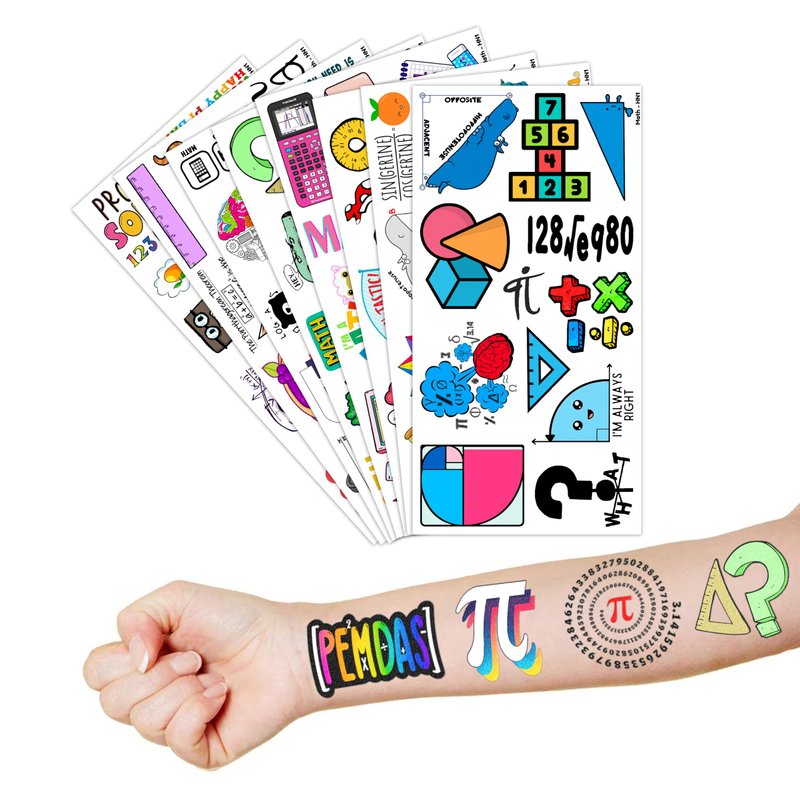 - Cute And Funny Cute Math Formula Symbols Mathematics Themed Tattoos: Fast food Temporary tattoos Stickers, features an assortment of themed characters, colors are bright, and designs are adorable, use them as party favors and your kids will love. Perfect for themed party, birthday activities, school reward and other party events. They will be your kids' favorite small gifts.