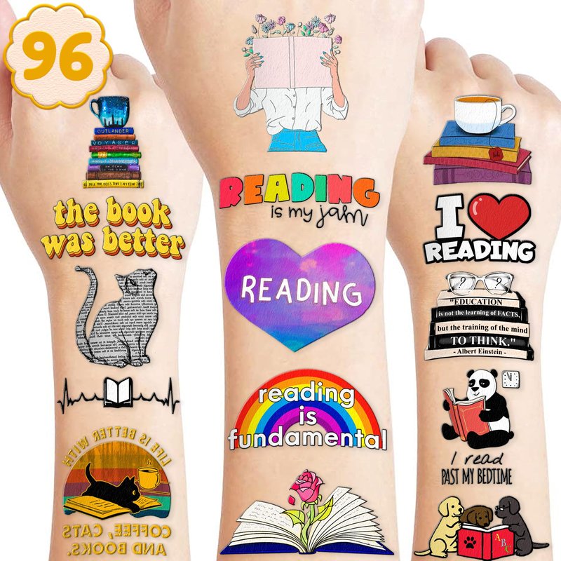 - Perfect Funny Reading Book Booklish Nerd Inspirational Quotes Birthday Decorations: All the temporary tattoos are design with many themed. Fits any smooth part: face, hands, arms, shoulders, back, legs water bottle, cup,mug and other stuff and so on. Great fun for party favors, birthday gift, clubs, festivals or party supplies,etc. and can be used by children, kids, girls, boys, women, men.