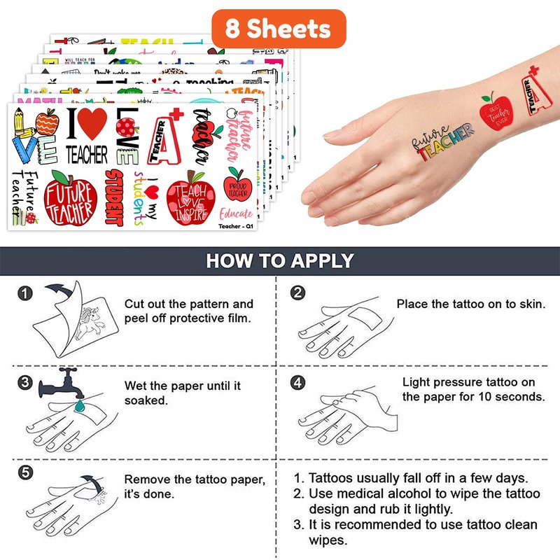 Future Teacher Day Quote Birthday Party Supplies: 8 Sheets 96 PCS Future Teacher Day Quote Teachers temporary tattoos stickers, Have a variety of cartoon themed characters, Children can easily Future Teacher Day Quote stickers and take unique photos to make fond memories. The size of each sheet is 6.1 * 3.1 inches. Future Teacher Day Quote Birthday Party Decoration: The set contains instructions for use and is easy to use. Future Teacher Day Quote tattoo stickers can be applied on arms, face, hands, neck, shoulders, legs, wrists and ankles to make you look cool at all kinds of parties. Popular hit with your kids. You can apply them to your body or some smooth objects, for example, glass, stationery, paper, crafts cups, cabinet, bottle. Cute And Funny Future Teacher Day Quote Themed Tattoos: Future Teacher Day Quote Temporary tattoos Stickers, features an assortment of themed characters, colors are bright, and designs are adorable, use them as party favors and your kids will love. Perfect for themed party, birthday activities, school reward and other party events. They will be your kids' favorite small gifts. More Safety & Healthy Choice: These temporary tattoos are made of high quality safety and green paper, Non-allergenic and totally safe for your kid's skin. Simply wet the tattoo with water and stick transferred them onto your body, hands, faces and arm you like. Tattoos will last from 3 to 5 days ,it also can be easily removed with baby oil, makeup remover or rubbing alcohol. Not recommended for people with a history of sensitive skin, if symptoms appear, stop using immediately. How to Use: Cut out tattoo of choice and remove clear sheet. Place tattoo face down on skin. Wet the tattoo thoroughly with a sponge. After 20-30 seconds, gently remove the backing paper. Allow the tattoos to dry. Very easy to use.