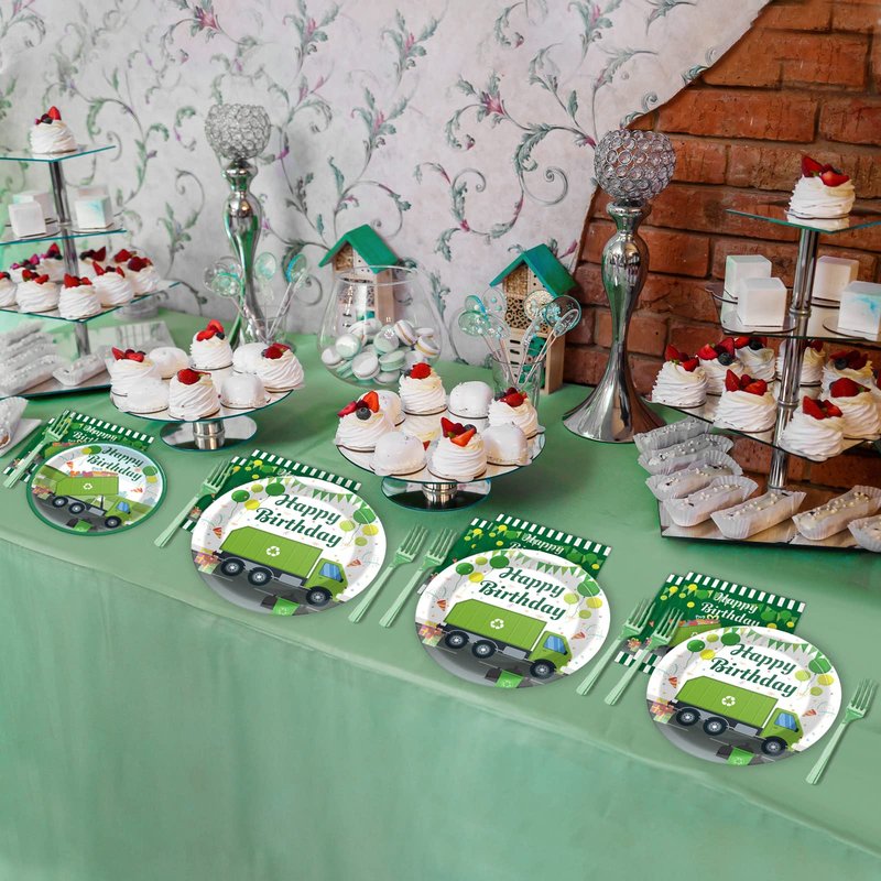 - 【Waste Management Recycling Bin Party Design】Except for the fork, this garbage truck theme party tableware set is all designed in while background and vibrant green patterns. Decorating your garbage truck theme party with these tableware kit can make your party full of the festival atmosphere.