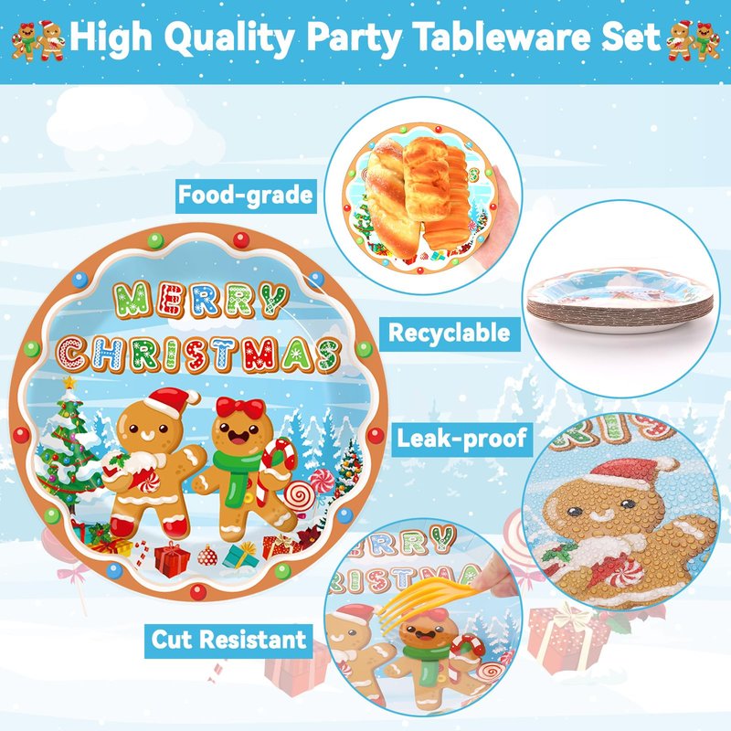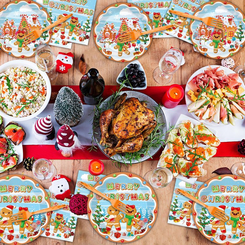 - 【Cute Christmas Party Table Setting】These Gingerbread Party Supplies Paper Plates Napkins can serve 24 guests, enough quantity for Christmas Family theme Holiday Party.Guests will be so excited to see this bright colored awesome Christmas party decorations Favors.