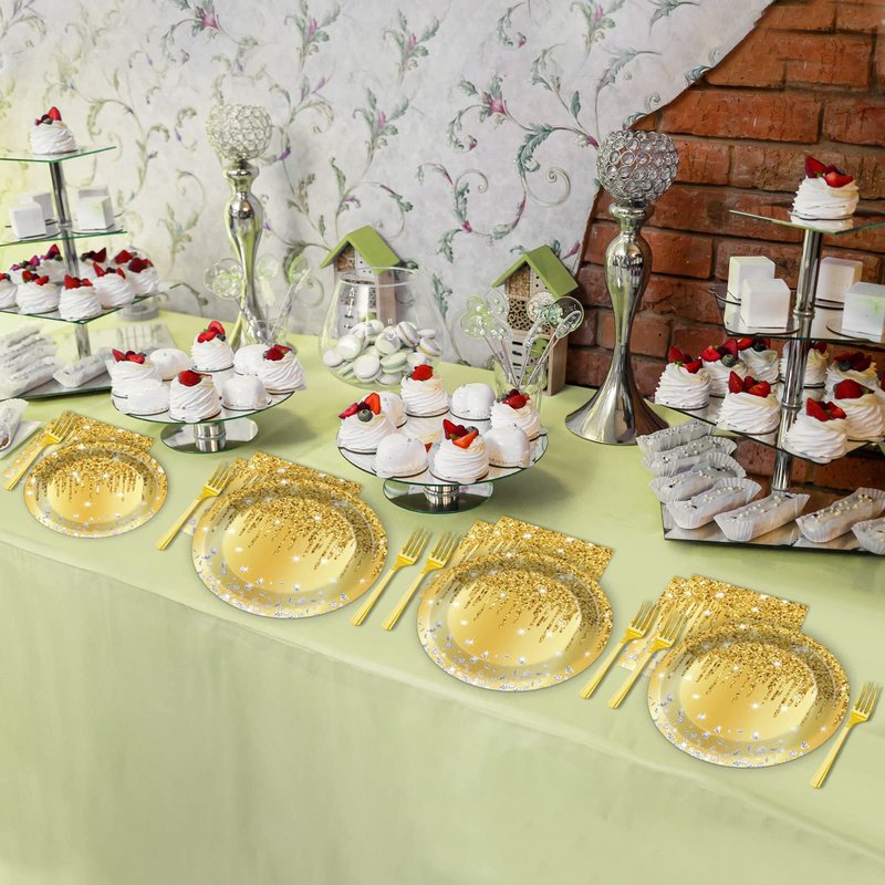 - Perfect for every occasion: Gold party supplies set of paper plates napkins gold plastic forks and is the perfect choice for all events and occasions.Such as wedding, engagement parties, girl and boy birthday parties, adult parties, bridal shower, housewarming parties, graduation and get -together parties and so on.