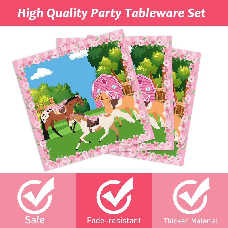 - 【Premium Material】All of our horse party plates and napkins are made of quality paper, non-toxic, no smell, heat-resistant and durable. The pattern and color are well-printed and fade-resistant to provide you with a party that full of pink horse theme atmosphere.