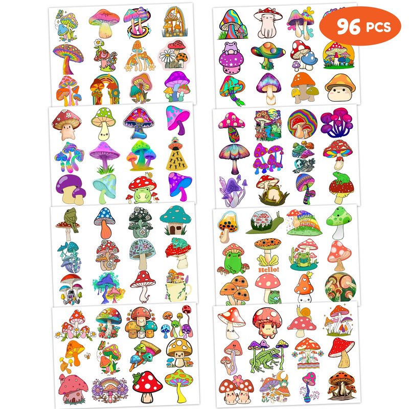 96 PCS Mushroom Temporary Tattoos Mushroom Veggie Theme Birthday Party Decorations Favors Supplies Decor Trippy Cute Stickers Gifts for Boys Girls Kids Class School Prizes Carnival Halloween Christmas