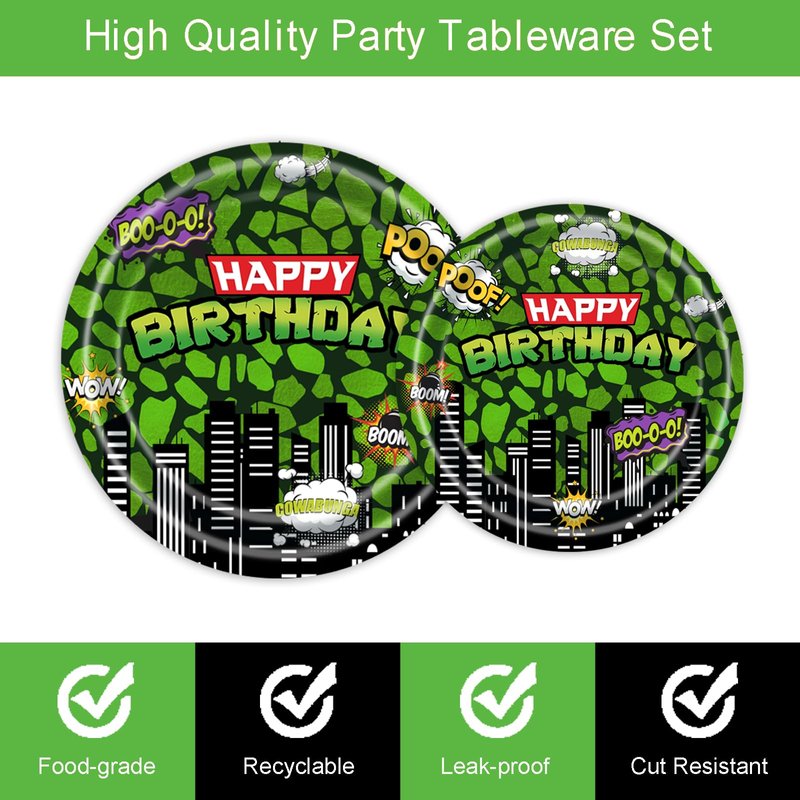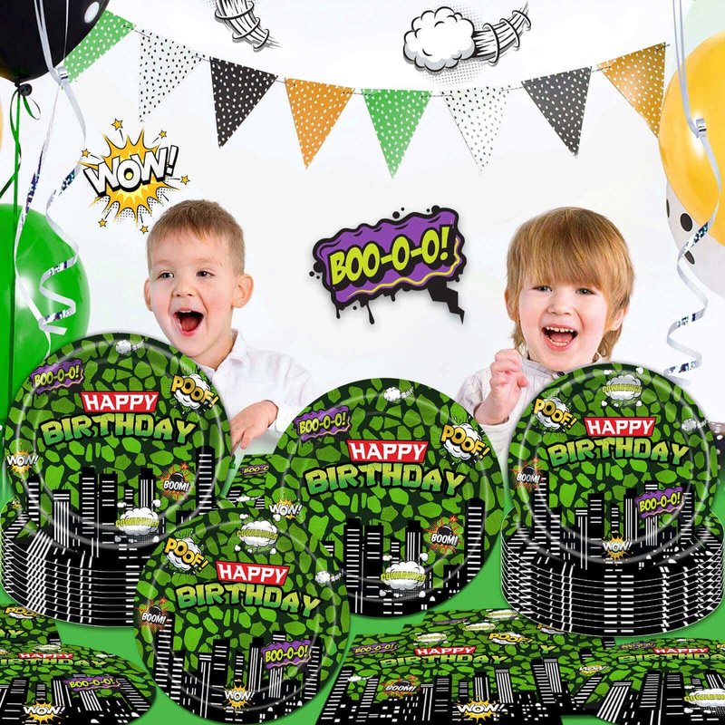 96 Pcs Ninja Superhero Birthday Party Plates and Napkins Green Comics Cityscape Buildings Party Supplies Set Boy Kids Green Tortoise Birthday Party Decorations Serve 24 Guests Tableware