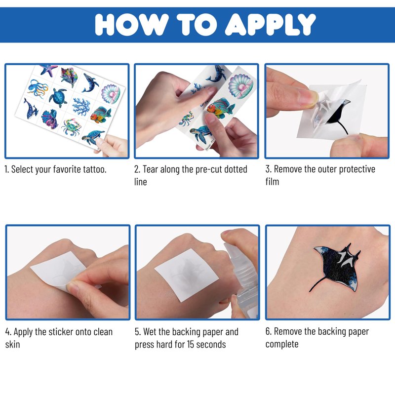 - Pattern rich: Ocean Blue Animals Under The Sea Turtle Temporary Tattoos include 8 Sheets 96 PCS, the size of each sheet is 4.7 * 6.3 inches. Easy to share,even if a lot of people's parties, you can have a different tattoo with others.These adorable tattoos will keep you and your little ones – and their friends – occupied for a while.