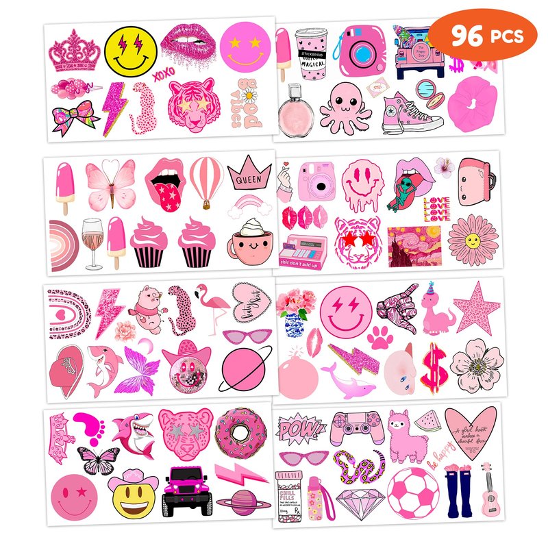 96 PCS Pink Preppy Bachelorette Princess Temporary Tattoos Theme Birthday Party Decorations Supplies Favors Decor Cute Girl Pastel Face Tattoo Stickers Gifts for Kids Girls Boys School Prizes Carnival