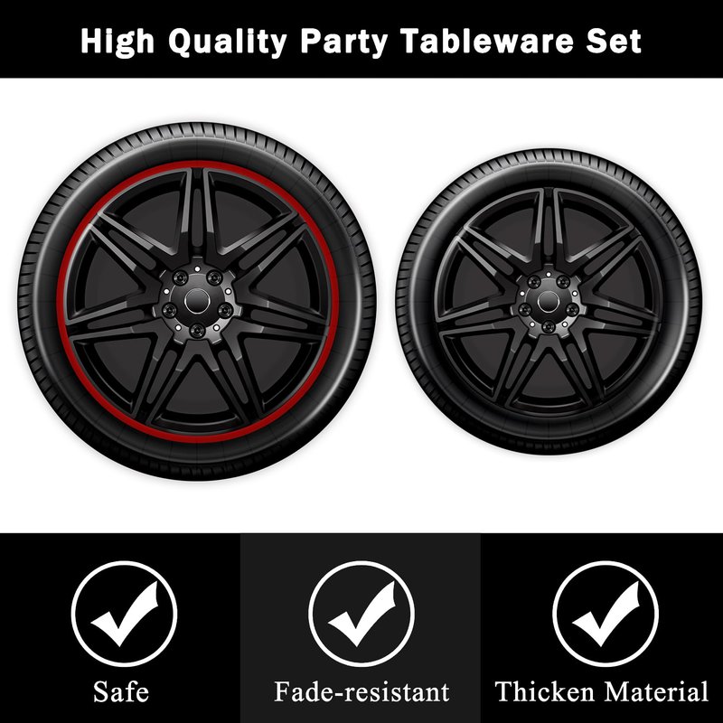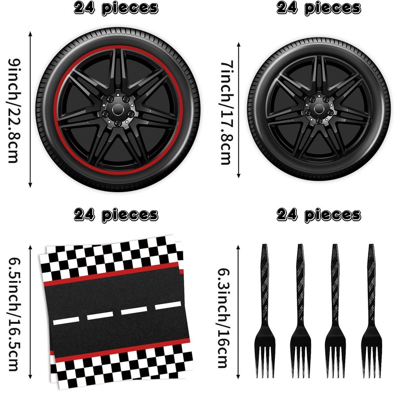 - Package Includes: You will receive 24 pieces of 9-inch race car party plates, 24 pieces of 7-inch racing paper plates, 24 pieces of forks, and 24 pieces of race car theme napkins, 96 pieces in total. These racing themed party decorations will be sufficient to meet your needs for serving 24 guests.