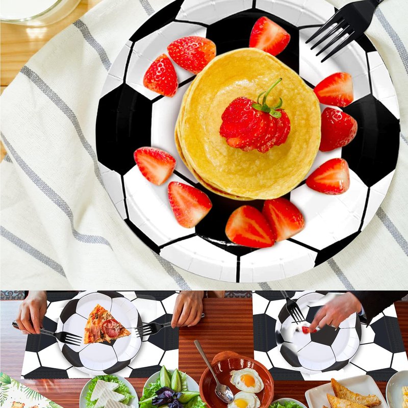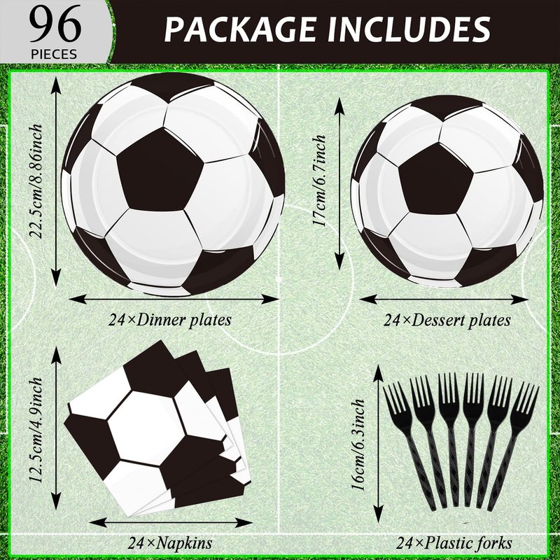 - This Soccer birthday party supplies set includes: 24 plates (9inch) + 24 plates (7inch) + 24 napkins (13inch) + 24 forks, There are a total of 96 pieces in this set, which will add fun to any Soccer theme birthday party.