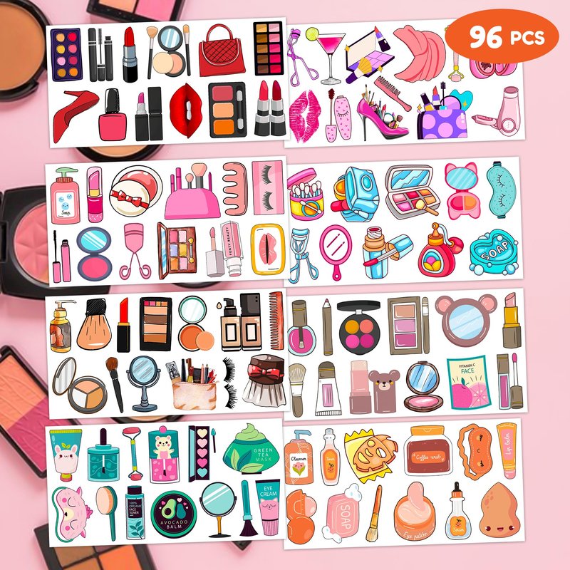 - Pattern rich: Spa Makeup Beauty Cosmetic Nail Temporary Tattoo for Kids include 8 Sheets 96 PCS, the size of each sheet is 6.1 * 3.1 inches. Having a variety of characteristics, shapes and vibrant colors can stimulate your children's imaginations and bring a creative atmosphere to your Spa Makeup Beauty Cosmetic Nail Theme Party.