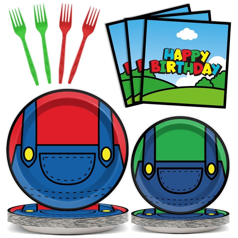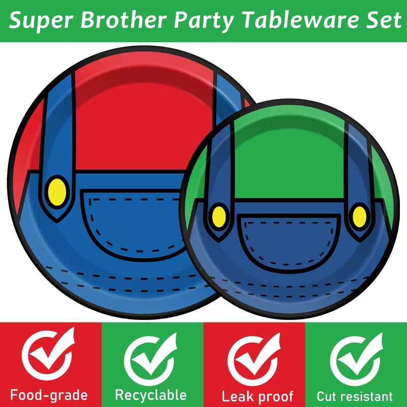 - 【Super Brother Party Supplies】Get ready for birthday party with this complete set of super brothers party supplies! Each set includes 24 pieces super brothers 9'' plates, 24 pieces super video games party of 7'' plates, 24 pieces napkins of 6.5’’, and 24 plastic forks - everything you need to serve up to 24 guests in style.