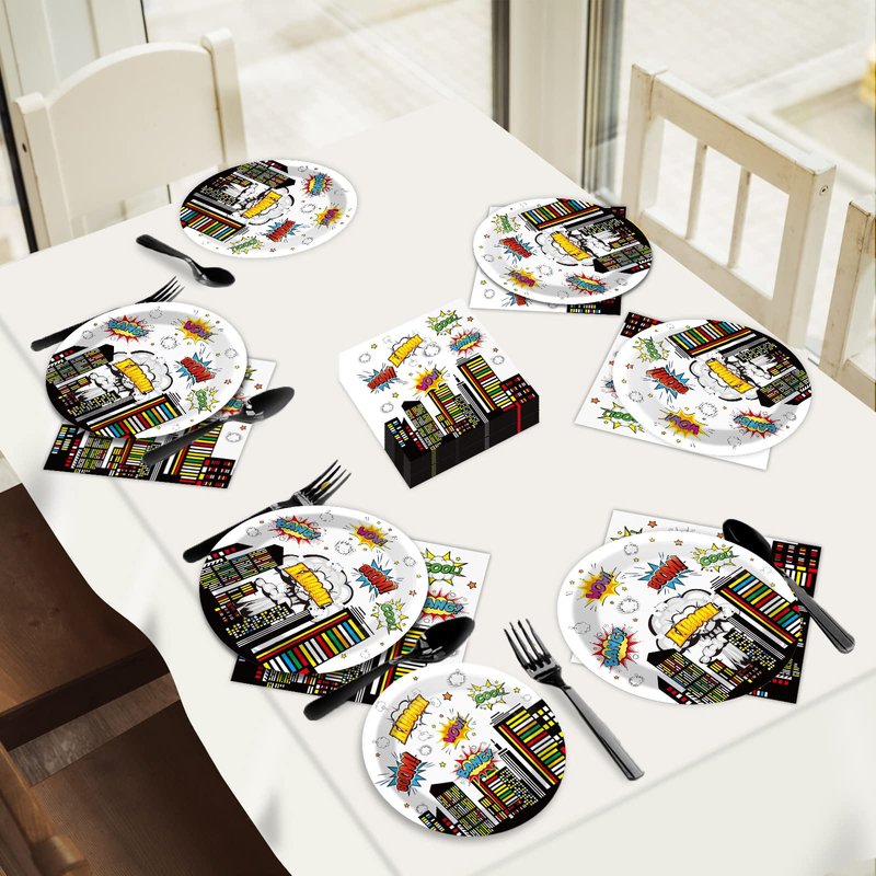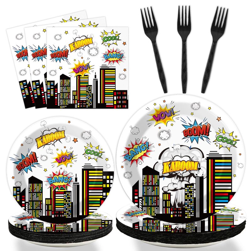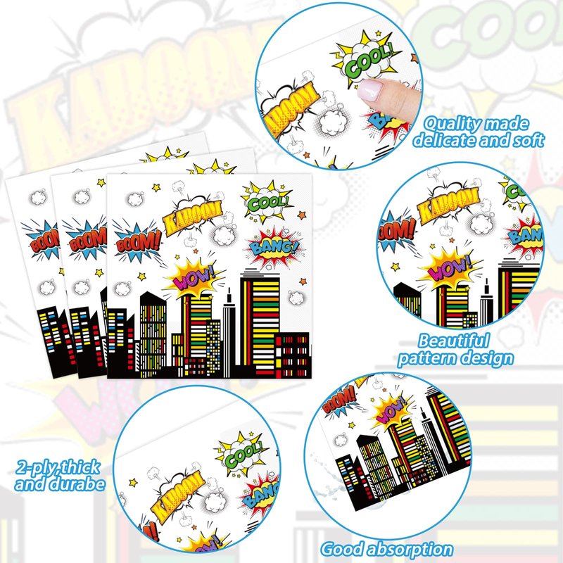 - 【Beautiful Design】There are building, onomatopoeia, colorful clouds. The pattern and color are well-printed and fade-resistant to provide you with a party that full of super theme hero atmosphere.