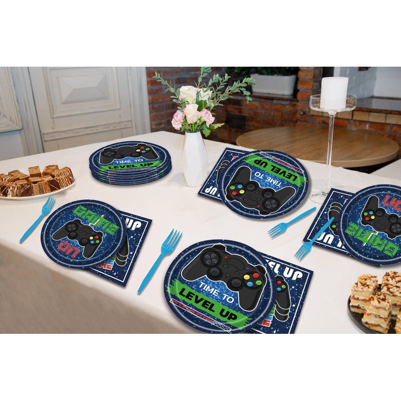 - What You Will Get: You'll receive 24 plates (9inch) + 24 plates (7inch) + 24 napkins (6.5inch) + 24 forks, there are a total of 96 pieces in this set, which will add fun to your video game party.