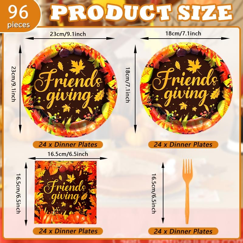 96 Pieces Friendsgiving Tableware Set Party Supplies - Fall Thanksgiving Pattern Disposable Dinnerware with Paper Plates, Napkins, Forks for Autumn Harvest, and Friendsgiving Dinner BBQ Picnic Favors